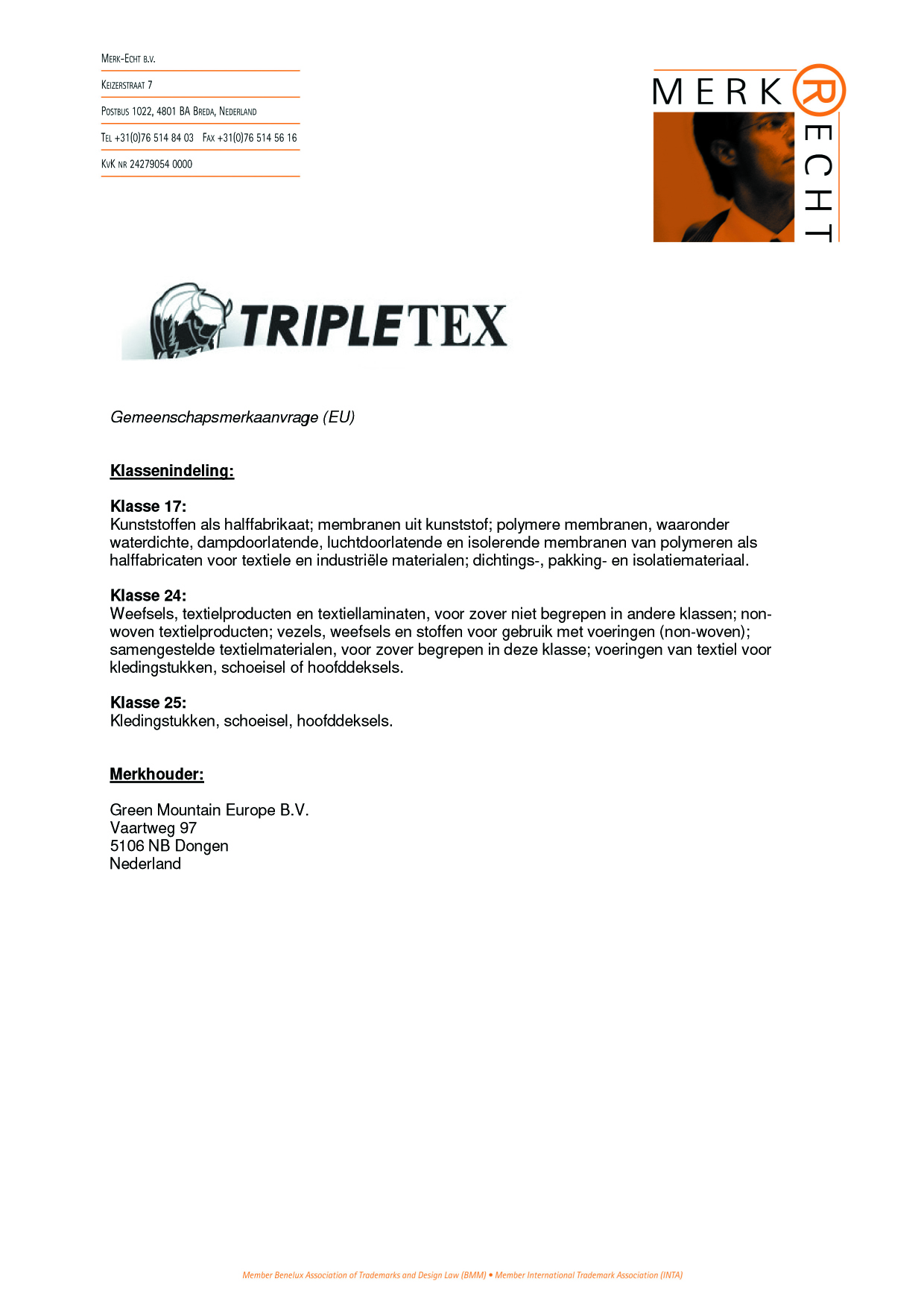 Bewijs van inschrijving EU merk TRIPLETEX